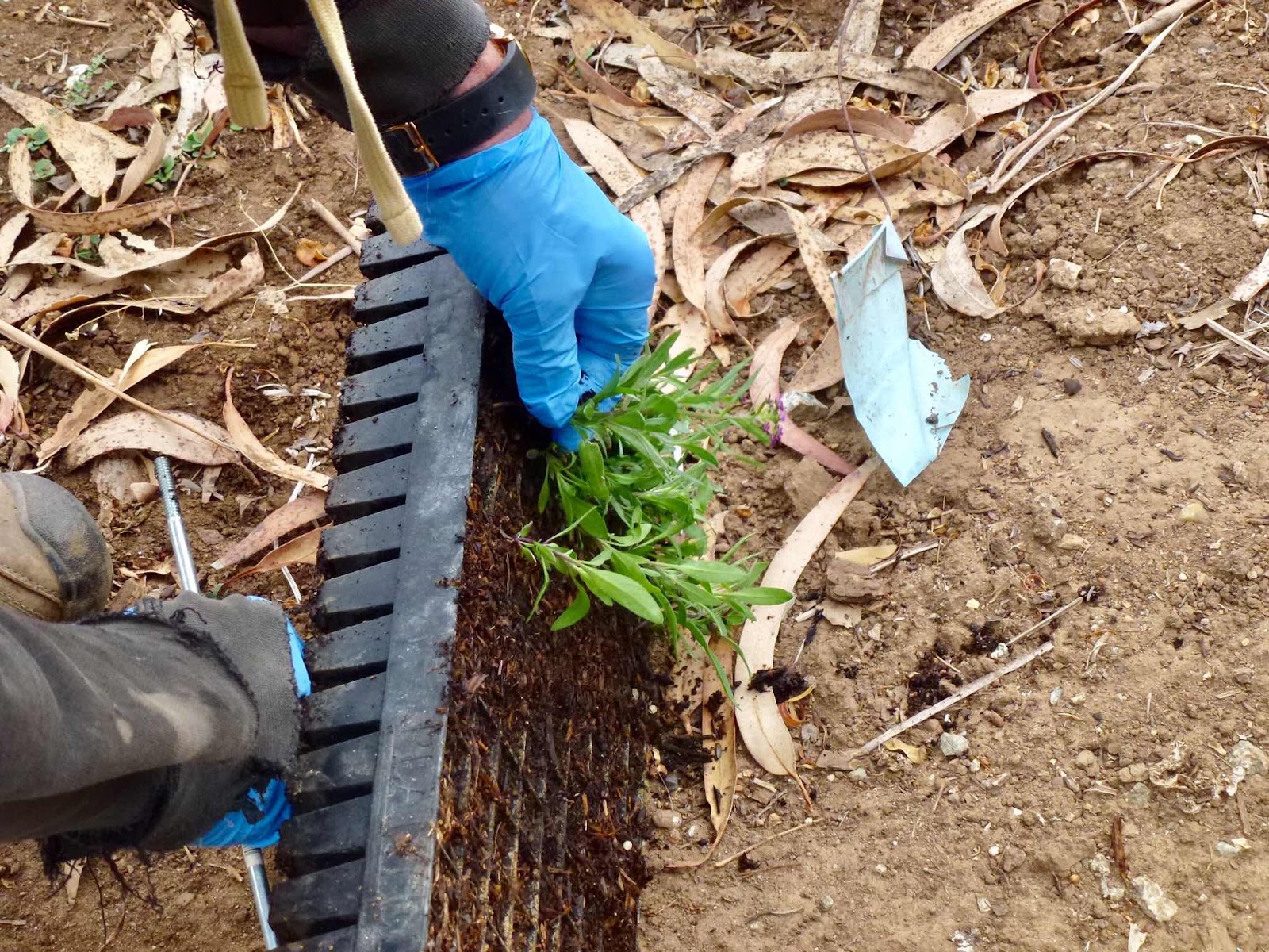 小さな苗は小さな四角いプランターの中にあるので、それを私が1つ1つ引っ張り出してジムに手渡す。 ジムは50年使っているというハンマーの尖った方で地面に小さな穴を開けると、そこに苗を移植。