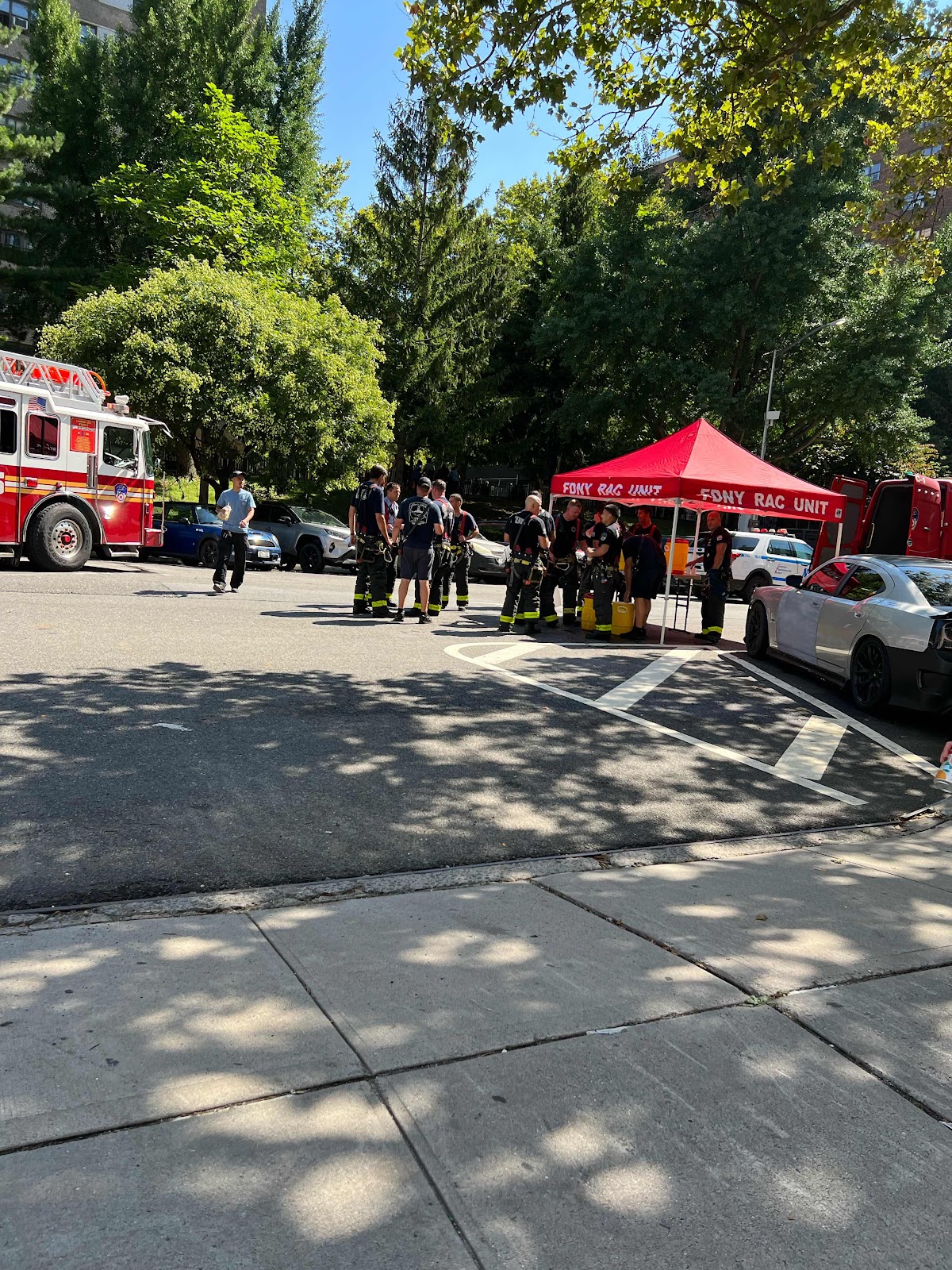 私が見ている目の前で、赤いテントが手早く組み立てられたかと思うと、そこはファイアFighter達の給水所でした。 皆が紙コップで水を飲みに来ていました。 この日は特に気温が上がり35度予想でしたから、重装備のファイター達は重たい装備を身につけかつ、酸素ボンベなどを担いで乗り込むわけだから、それはそれは重労働。 補給が必要です。