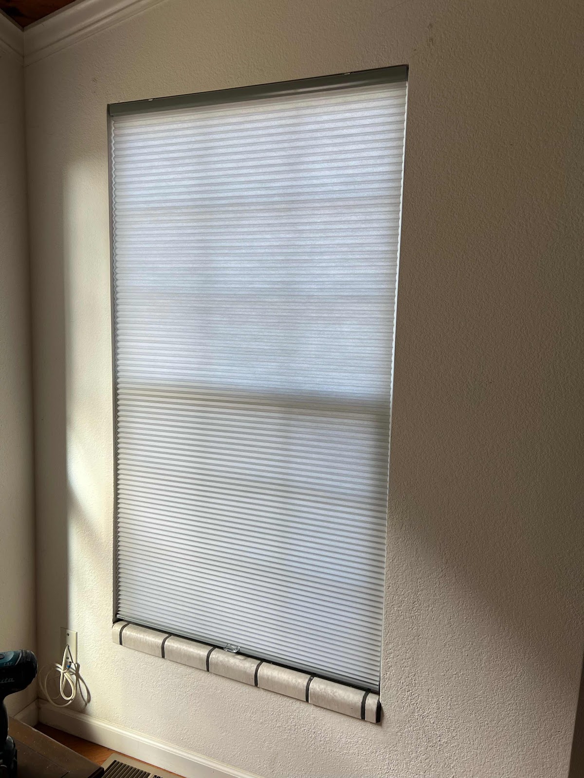 これは私1人ではできない作業でした。 窓枠の内側にブラケットと呼ばれる金具を取り付けなくてはいけないのですが、これ、窓枠に穴を開け、しっかりとスクリューで留めつけるので、ワイヤレス電気工具の登場。