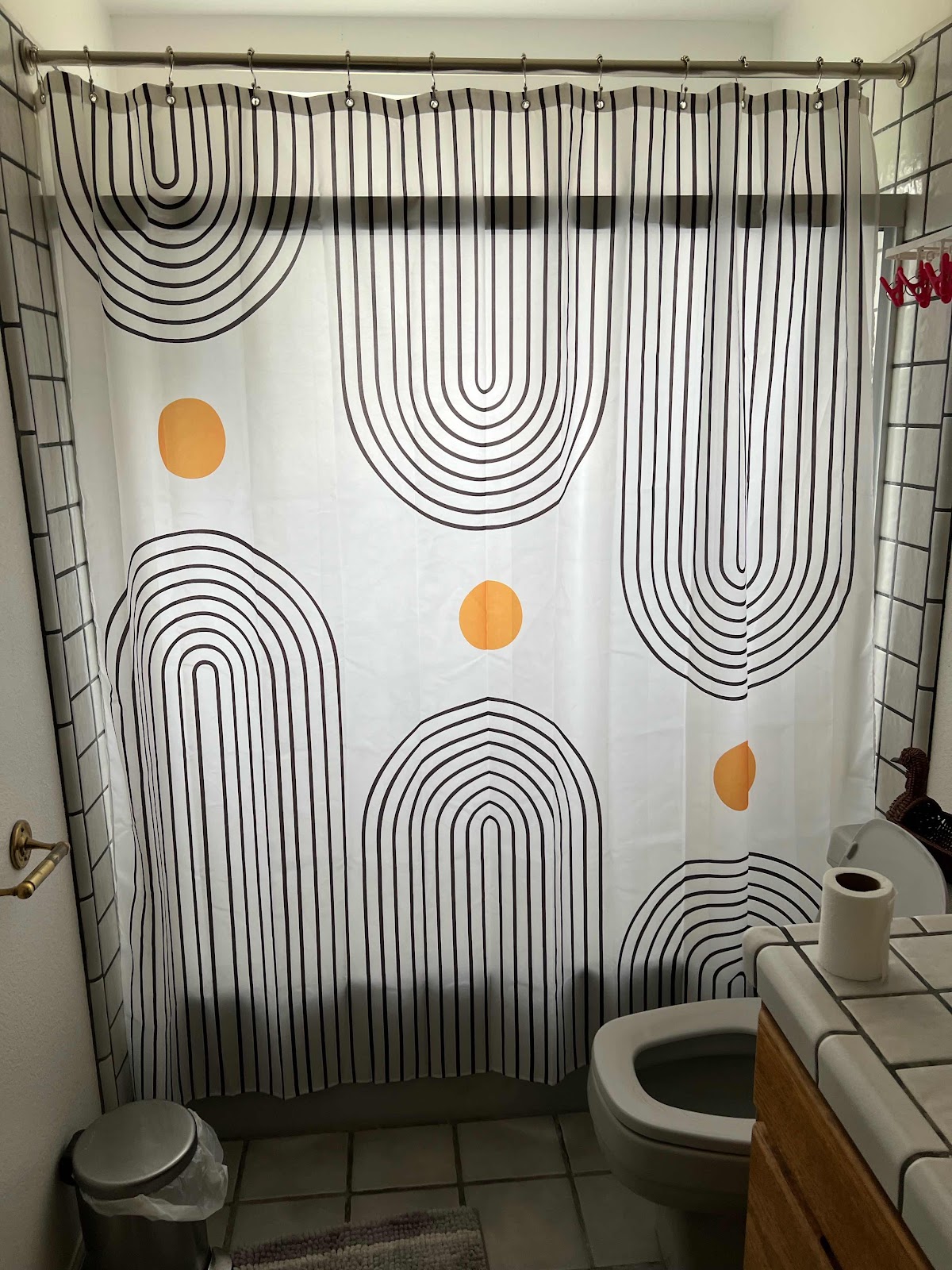 昨日はシャワーカーテンを取り付けました。 安物ですが、マ〜マ〜かな? 引き戸だった時は入口が半分のスペースしかなく、バスタブをまたぐのに、狭すぎるので、ガラスを取り外したのです。 あとはトイレの便座を高くするやつ、直前に取り付けるつもりです。